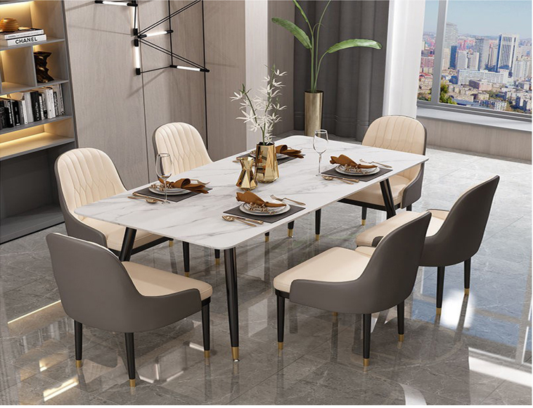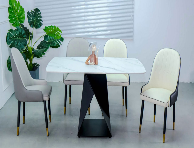 Bàn ăn mặt đá chân sắt tĩnh điện , ghế bọc da chân gỗ