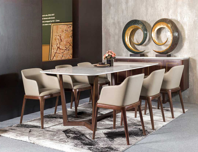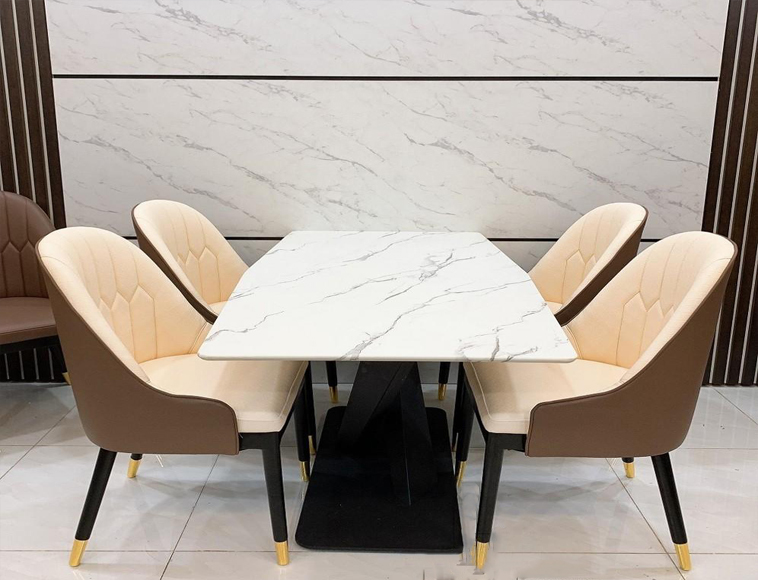 Bàn mặt đá, chân inox. Ghế khung gỗ tự nhiên tần bì sồi nga bọc đồng