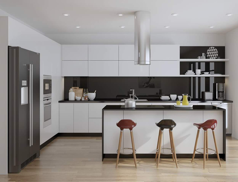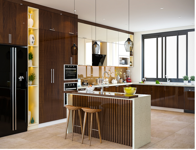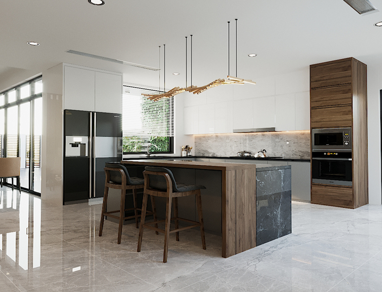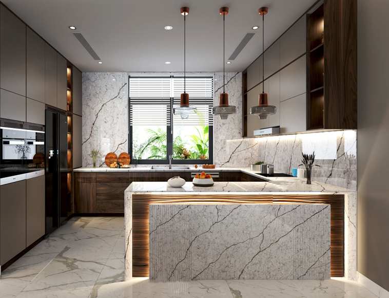 Chất liệu Mặt trên bàng đá tự nhiên, xung quanh quầy bằng gỗ tự nhiên óc chó nhập khẩu bắc mỹ phun sơn inchem cao cấp