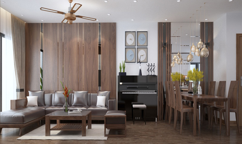 Thiết kế phòng khách và bếp gỗ óc chó nhà anh Thanh – 113-ngõ 84-Phú Xuyên Hà Nội